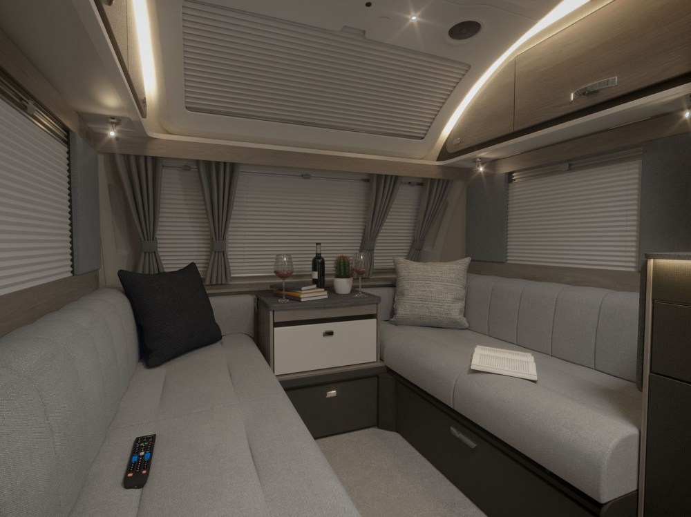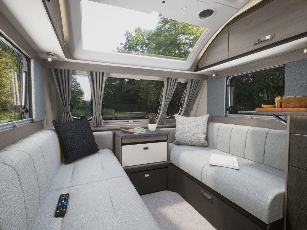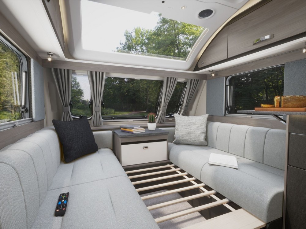 10. NEW Dometic panoramic front sunroof incorporating fully integrated curved blind system, recessed lighting and speakers (except 390)