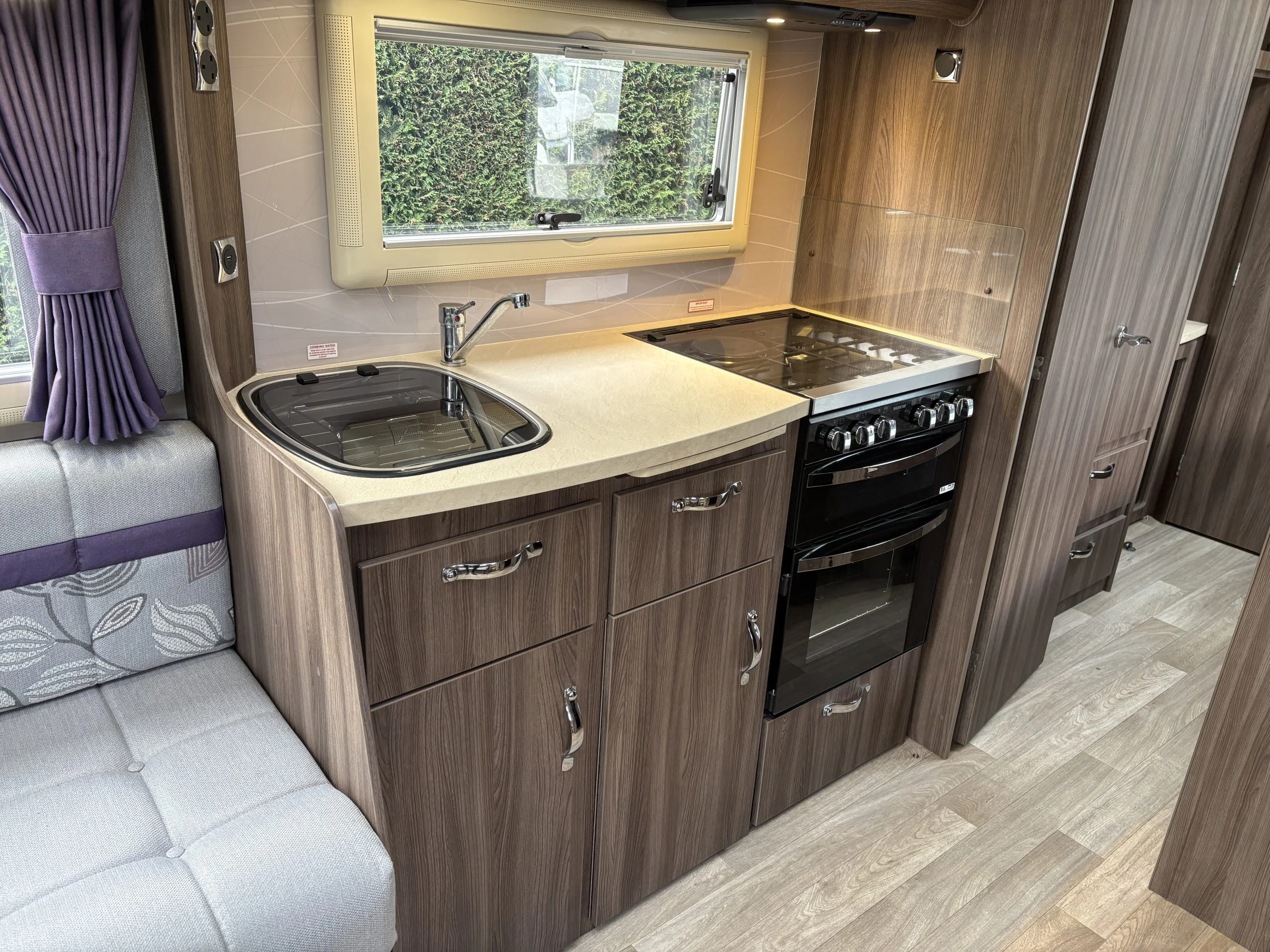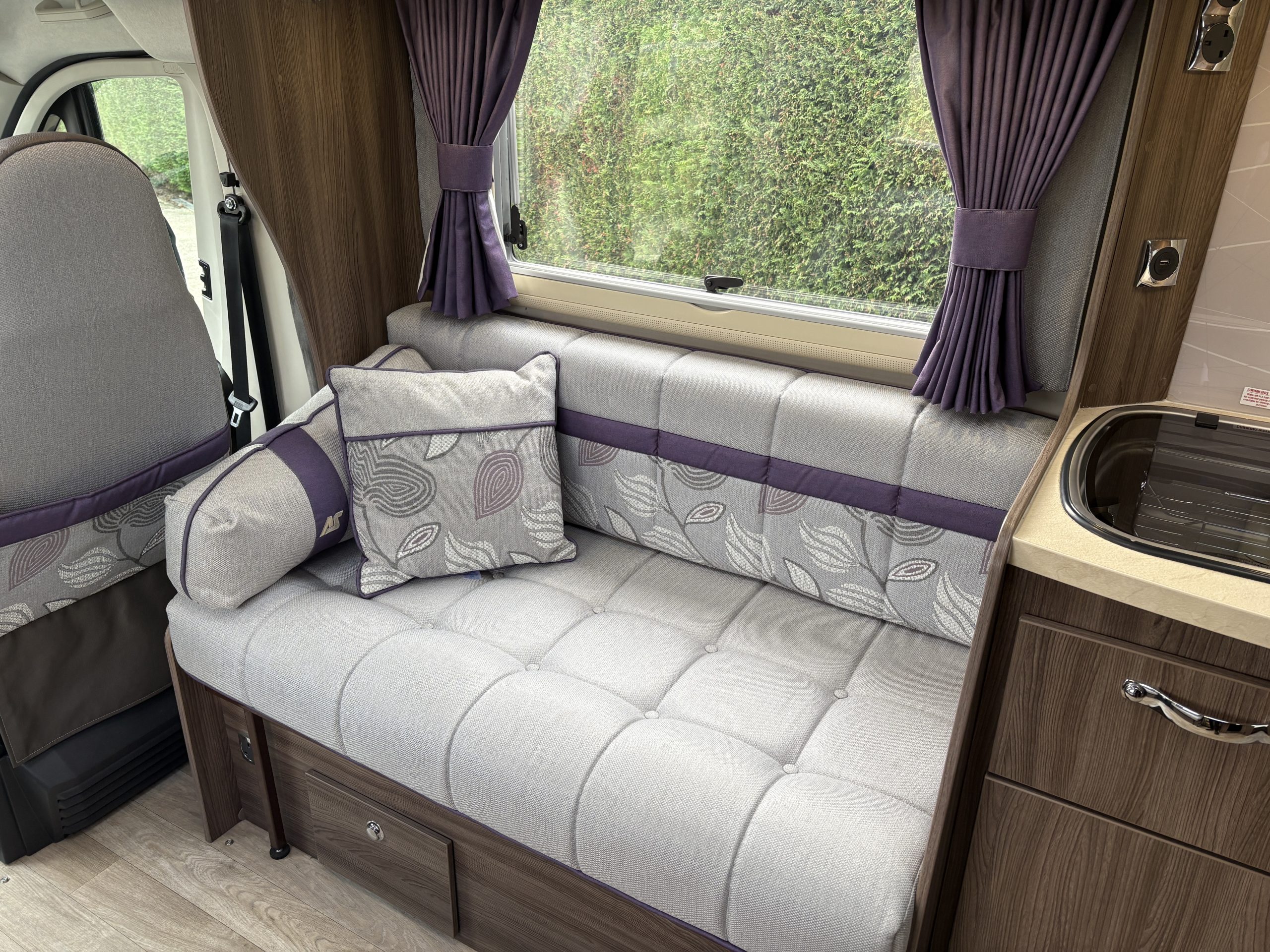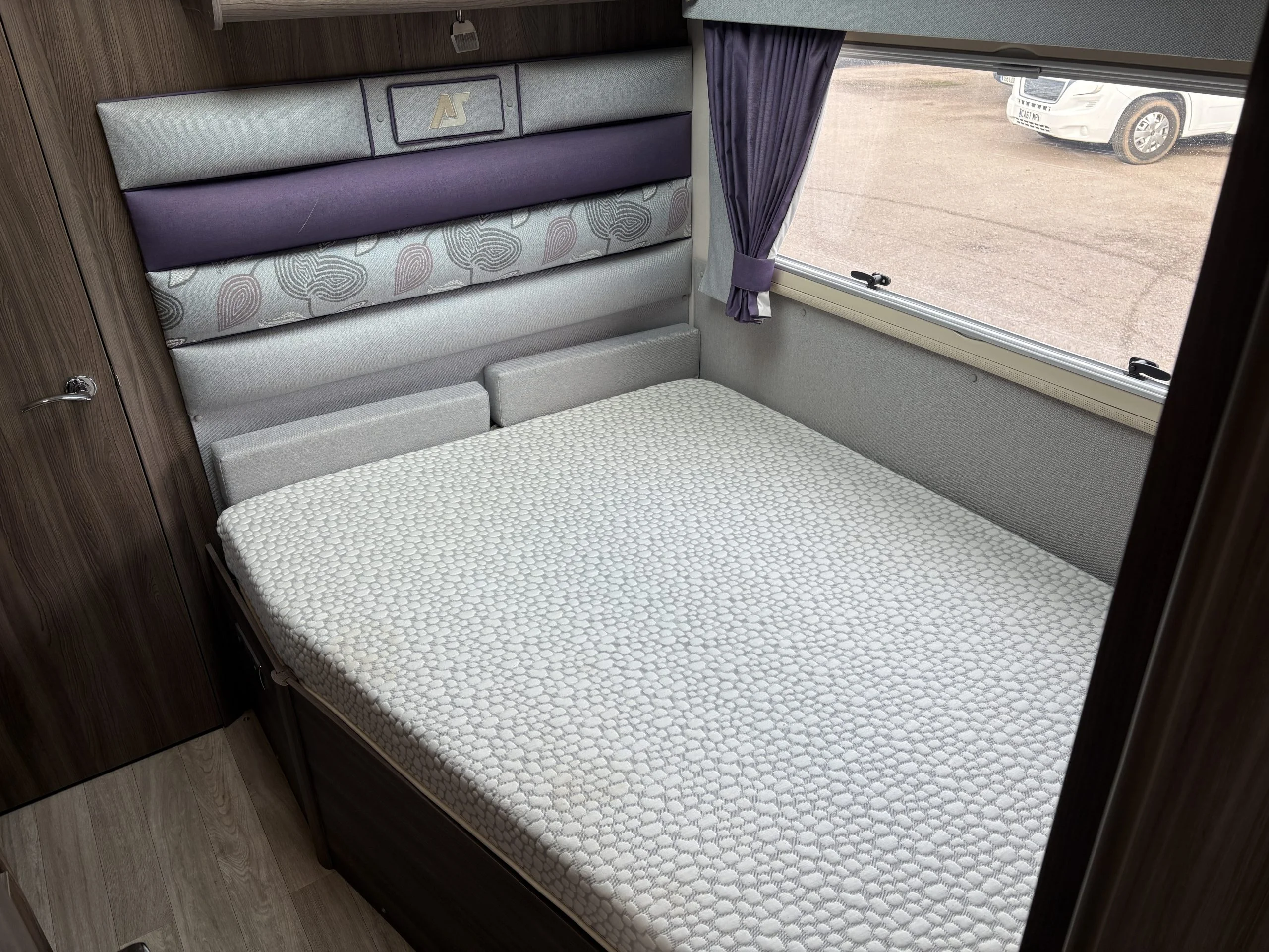 A permanent and incredibly comfortable french bed at the rear allows for a truly restful nights sleep without the need to make up a bed each evening whilst also featuring ample storage underneath.