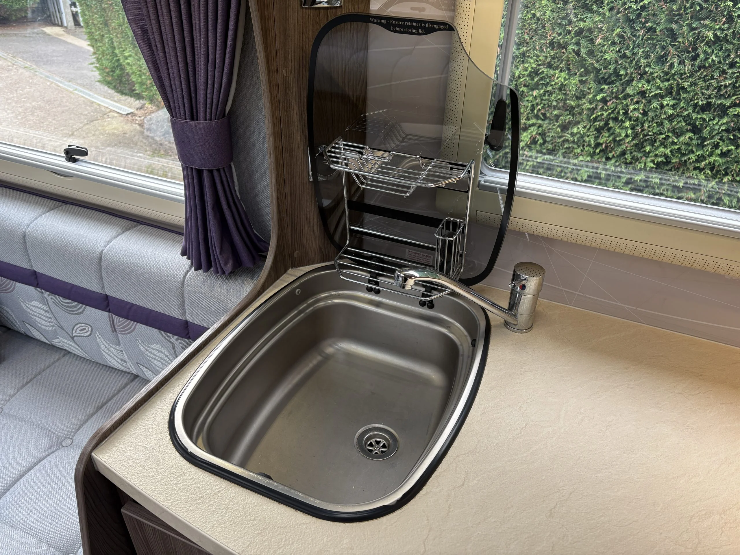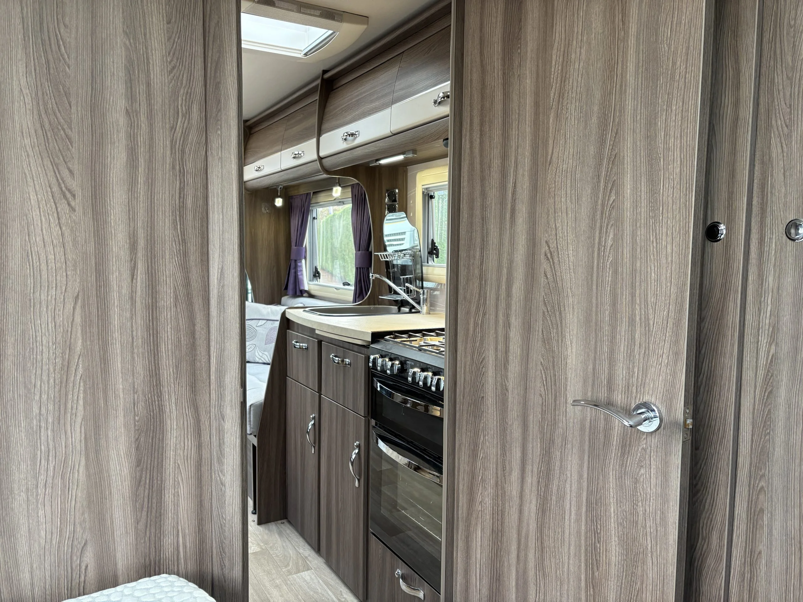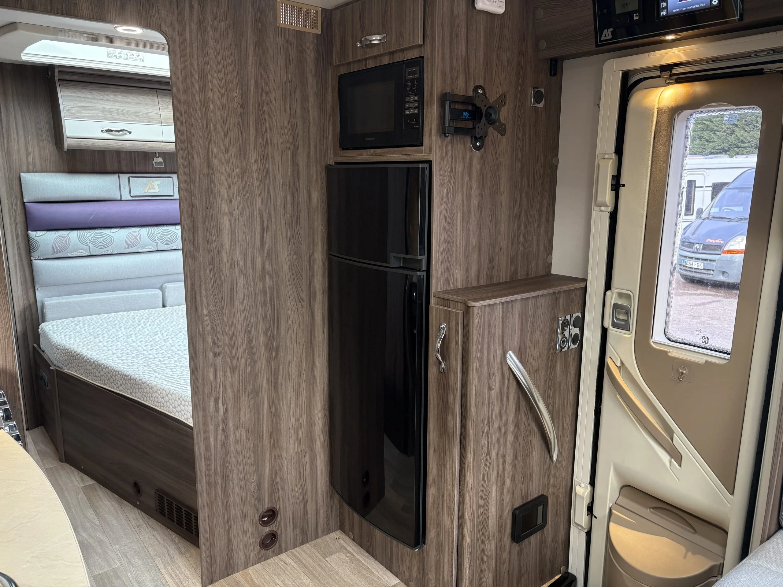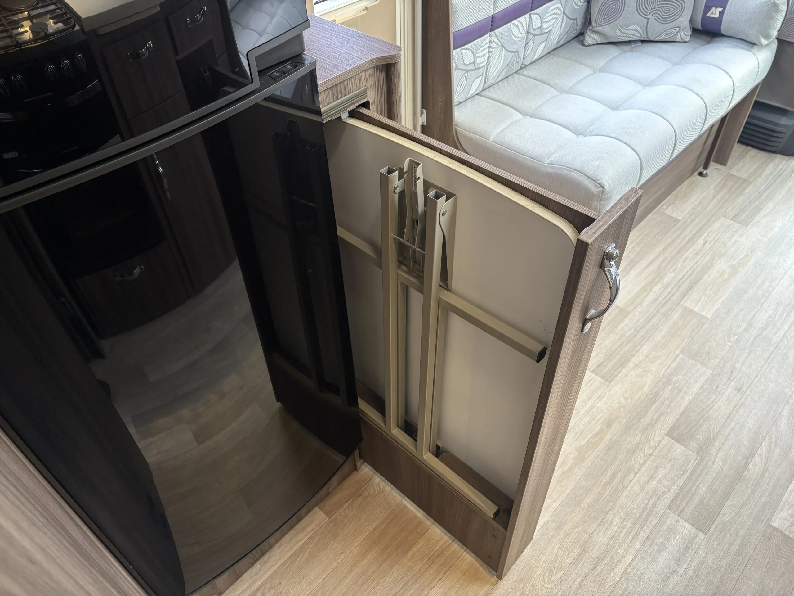 A permanent and incredibly comfortable french bed at the rear allows for a truly restful nights sleep without the need to make up a bed each evening whilst also featuring ample storage underneath.