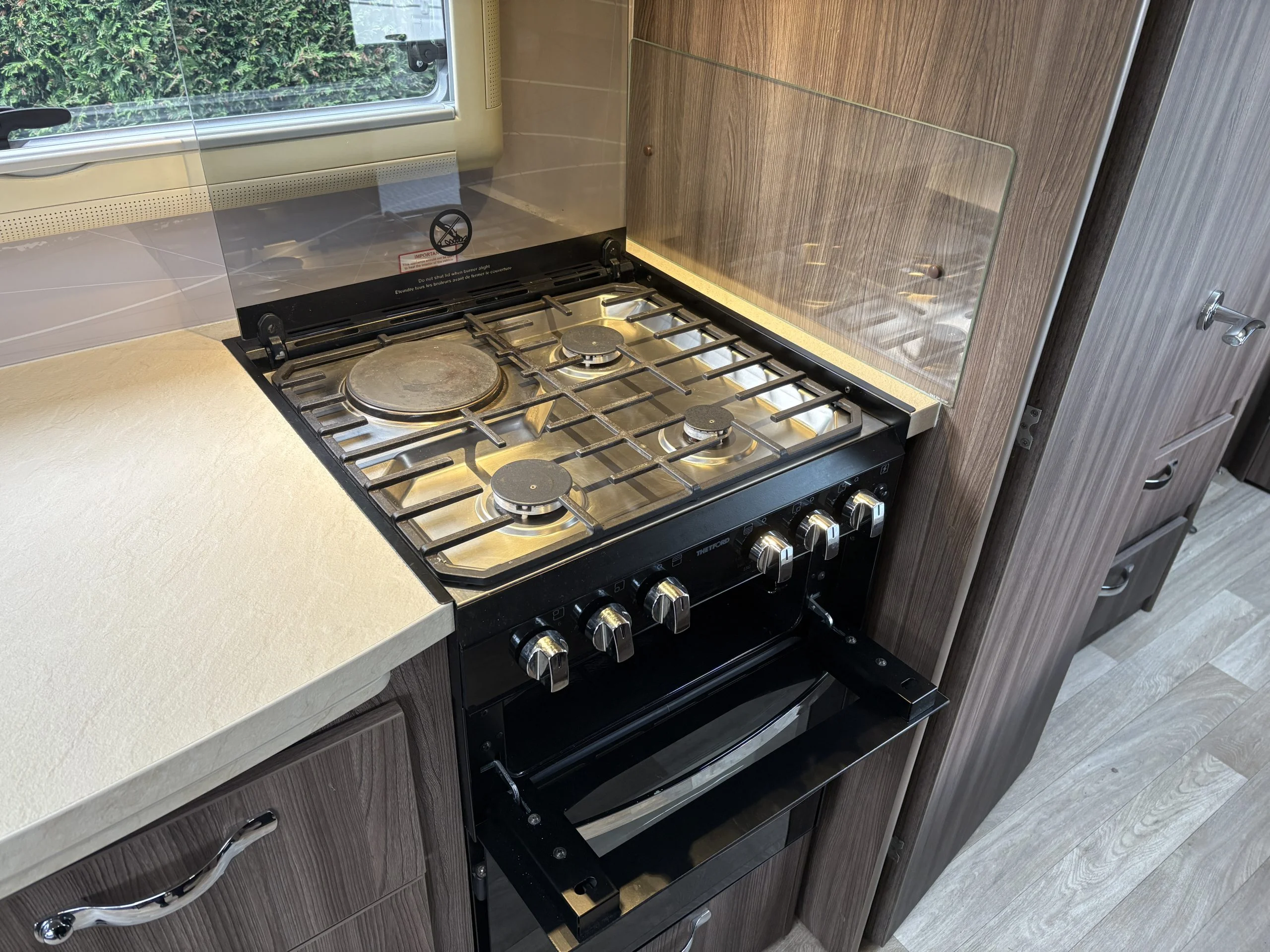 A high-specification kitchen area featuring a Thetford cooker with oven, grill and duel-fuel hob, microwave, and large fridge with freezer compartment. High quality worktops and ample storage complete the culinary space.