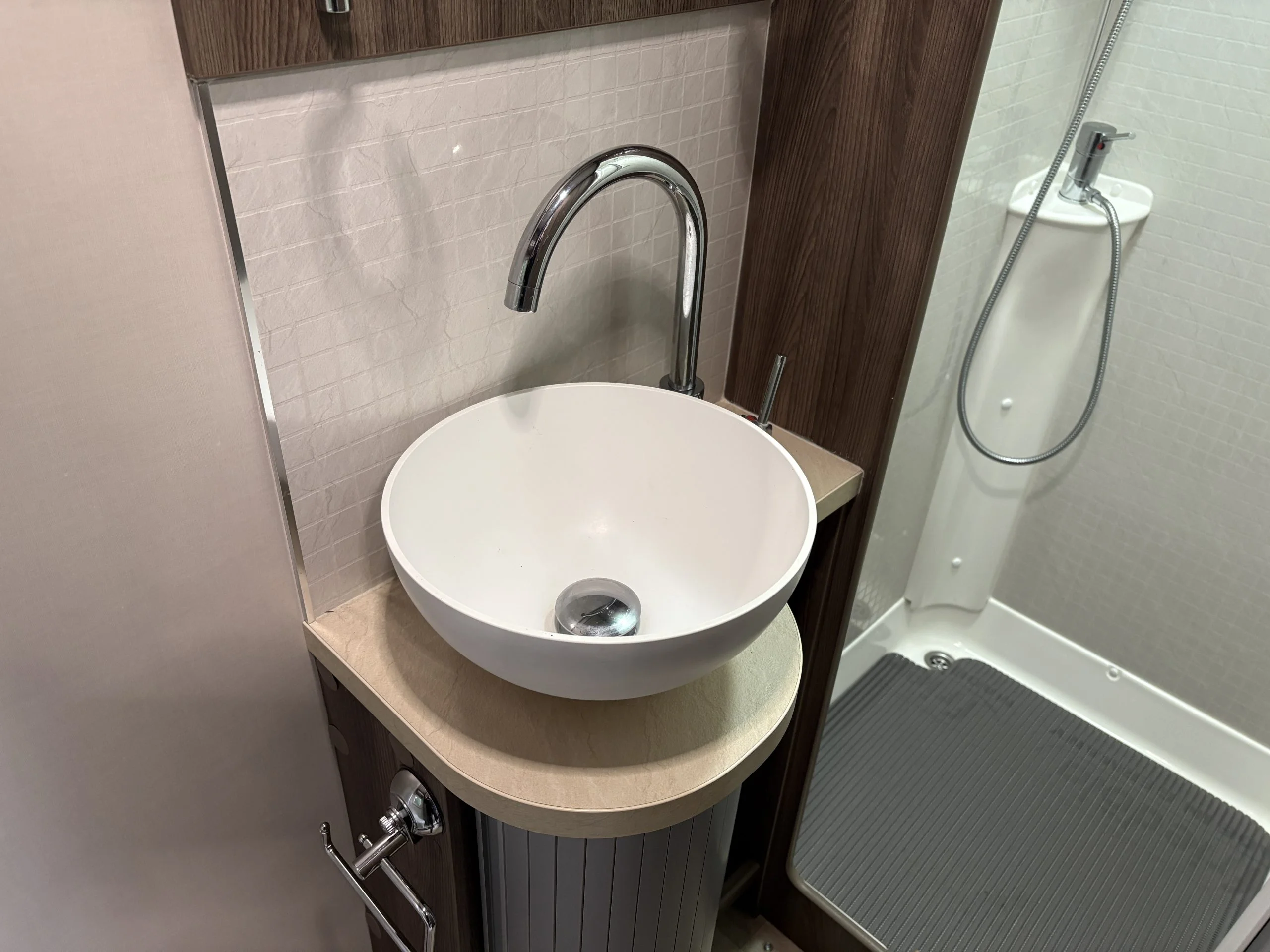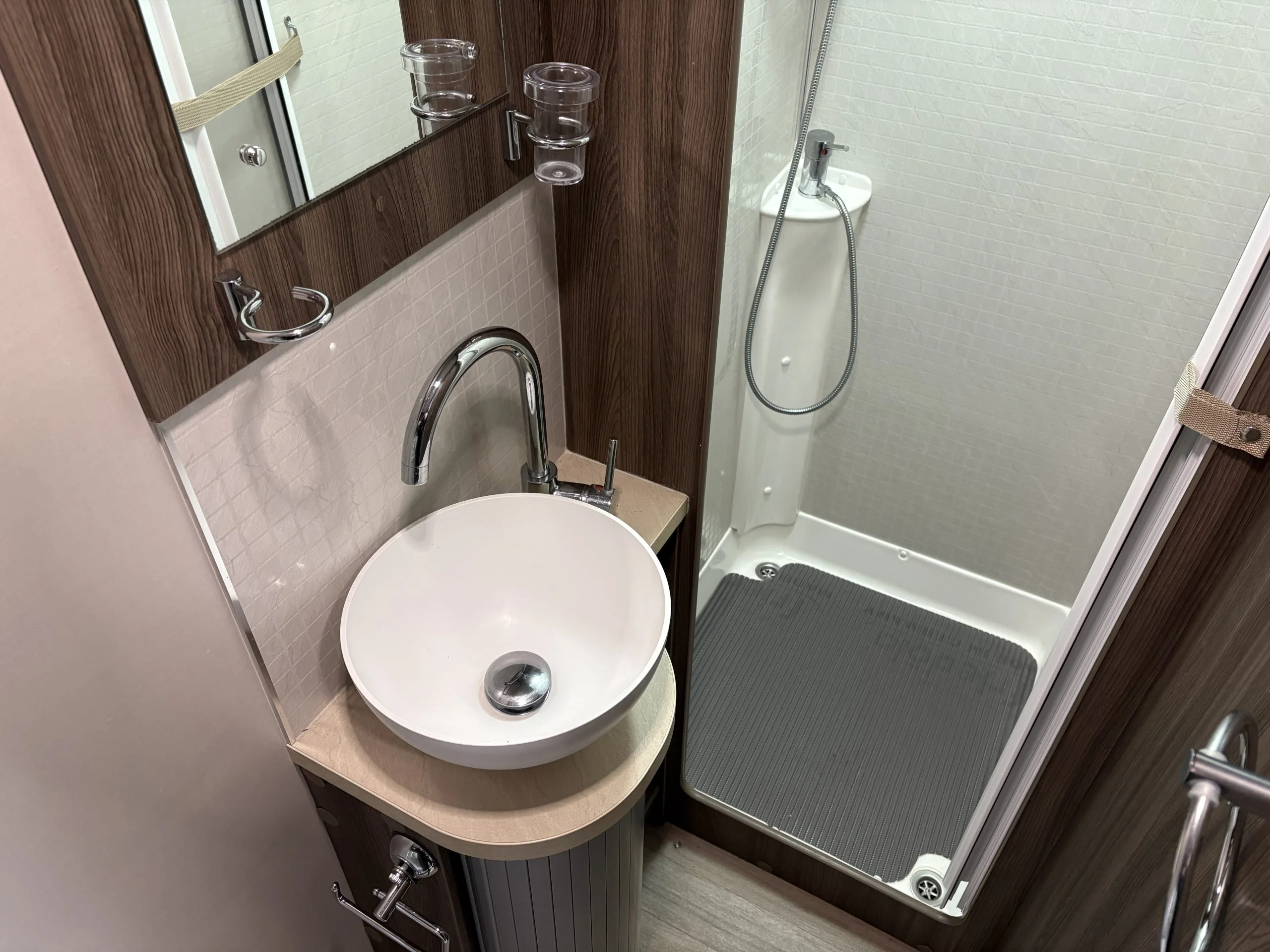 Located alongside the fixed bed, the washroom includes a Thetford cassette toilet, vanity basin and separate fully enclosed shower cubicle, providing a private and well-equipped facility.